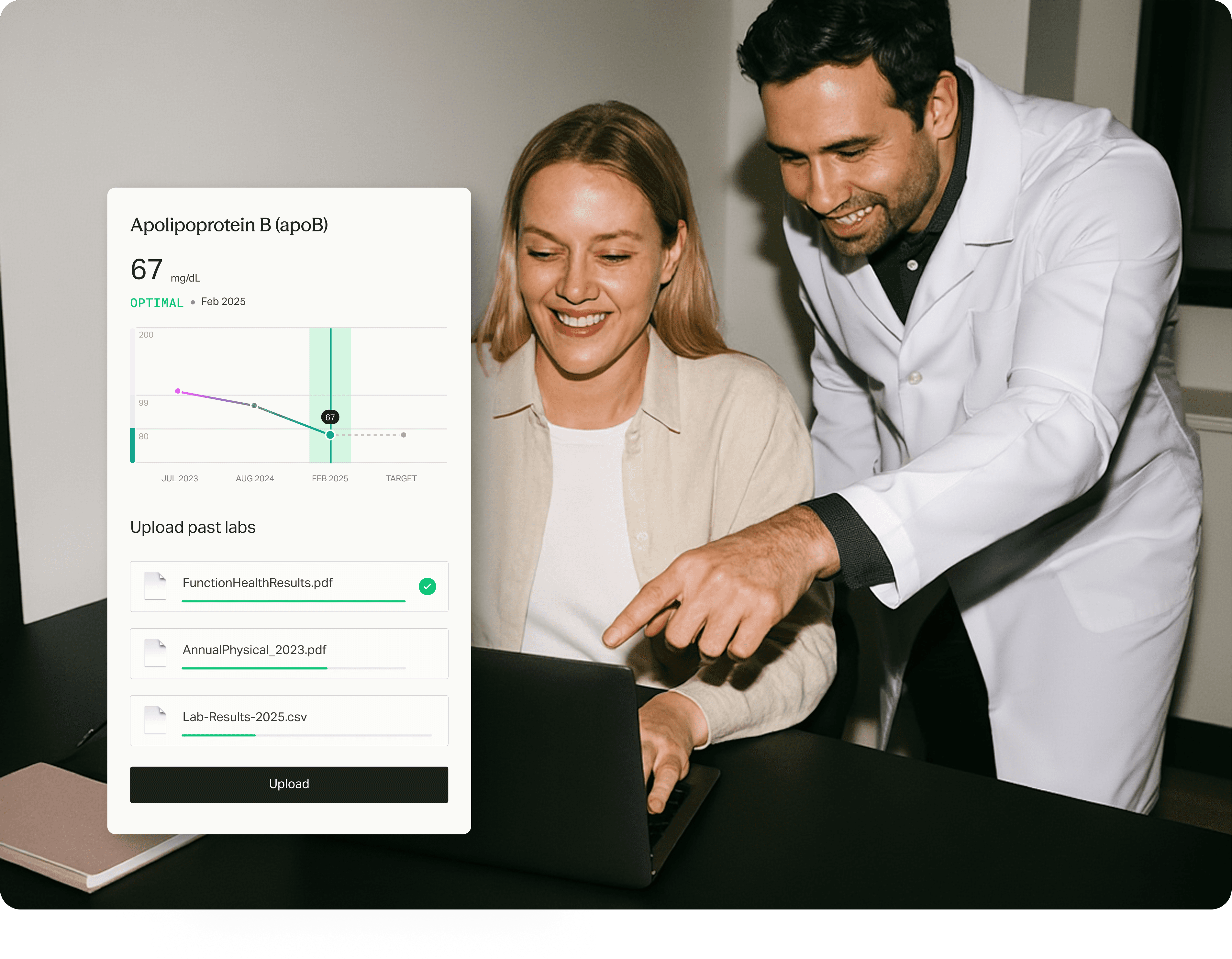Upload past labs and monitor changes over time. Know what’s improving, what needs attention, and when to retest.