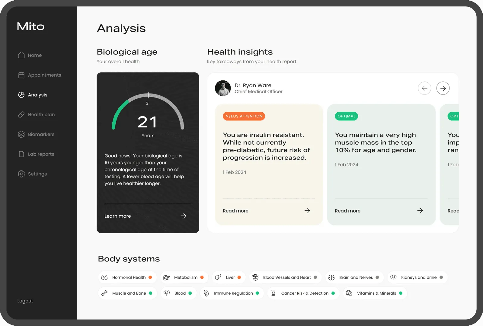 At Mito Health, knowing your unique biological landscape is the key to proactive health management and extending your lifespan. We harness the latest biomarker analysis to create a tailored roadmap for your journey to optimal wellness.